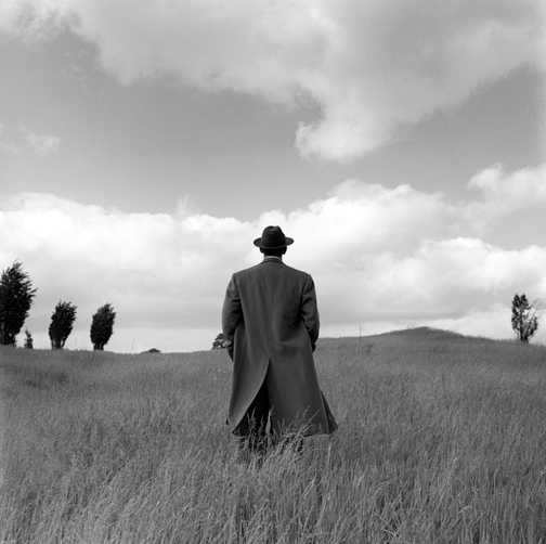 It was actually quite cool that day, so AJ, the model, was still wearing the coat as we were preparing lunch.  Just as he was sitting down, a workman from the stables where we were shooting walked by with this ladder.  Without realizing why, I decided to shoot a picture with the ladder against the wall. During this period, which extends to the present, I am so used to shooting the figure in a landscape, that it seemed incomplete to have a ladder without a figure. After convincing the workman to lend us the ladder, I placed the ladder against the wall and asked AJ to quickly climb it. He stopped where you see him.  It all seemed perfect.  I shot the picture. The whole process took less than three minutes.  The ladder was returned, and we went on to lunch.  It was not until after the shoot was over that I remembered I had even shot it.